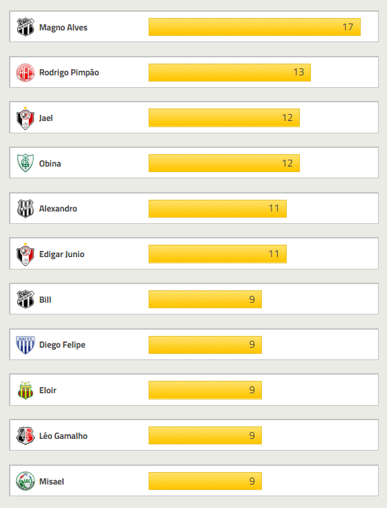 Com 8 gols marcados, Douglas é o artilheiro do Vasco na Série B. O goleador máximo da competição é Magno Alves, do Ceará, com 17 gols.