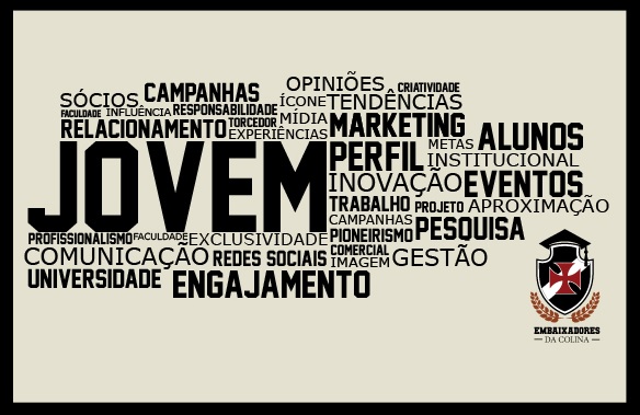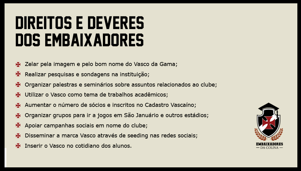 Após uma seleção com candidatos, foram selecionados 10 Embaixadores, que serão o ponto de contato entre o clube e o público jovem de sua respectiva faculdade e exercerão diversas atividades de interação com os alunos vascaínos. O perfil escolhido para ser o “ícone” cruzmaltino dentro da instituição é de um torcedor criativo, dinâmico, totalmente identificado com o clube, bem relacionado na faculdade e que tenha disponibilidade de tempo para se dedicar ao seu time do coração.