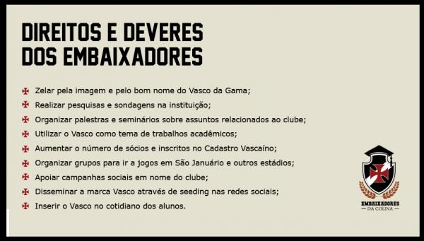 Para engajar os vascaínos das faculdades, os Embaixadores deverão realizar pesquisas de opinião, formar grupos para assistir aos jogos nos estádios, organizar palestras e seminários sobre assuntos relacionados ao clube e utilizá-lo como tema de trabalhos e projetos acadêmicos, dentre outras atividades que insiram o Vasco no cotidiano dos alunos.