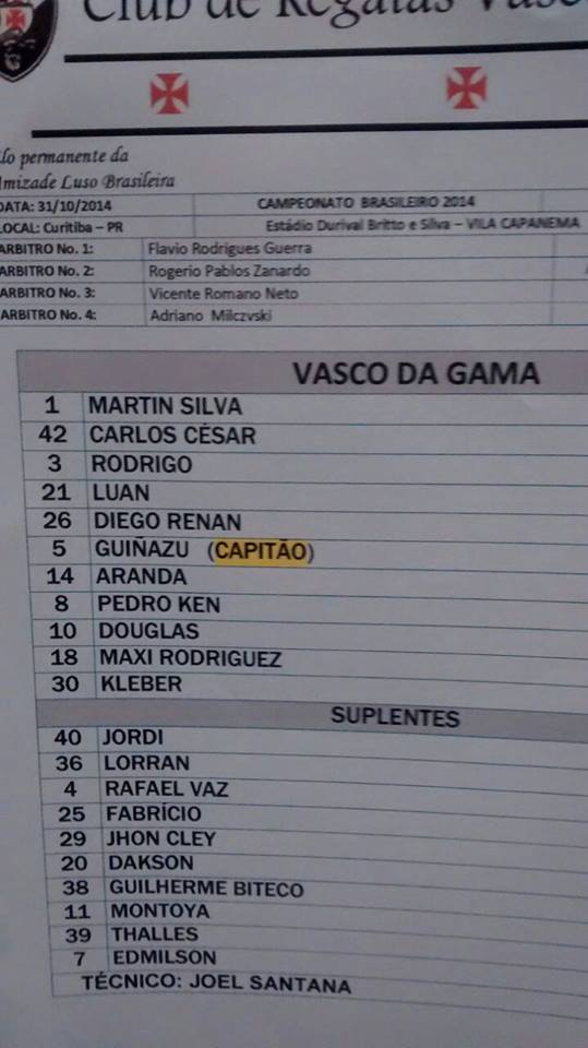Veja a escalação oficial do Vasco para o jogo contra o Paraná