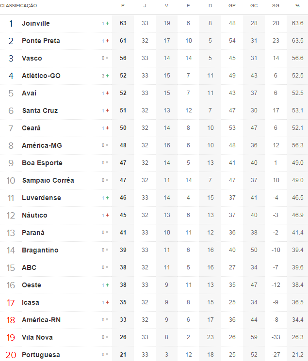 A Ponte Preta, com 61 pontos, recebe o Sampaio Corrêa e, se vencer, chega a 64 pontos, abre 8 em relação ao Vasco e retoma a liderança, que está com o Joinville desde a última 3ª-feira (28/10).