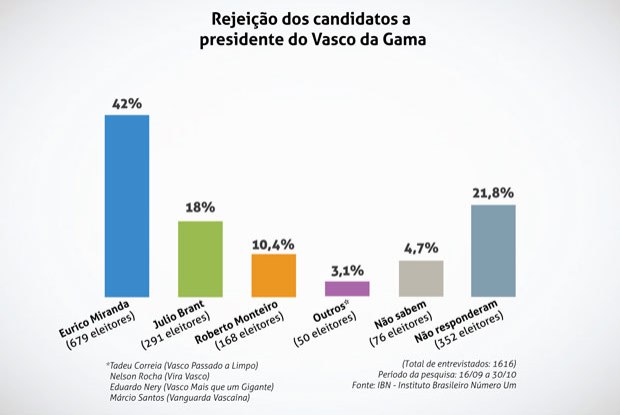 De acordo com a pesquisa, 42% dos eleitores não votariam de jeito nenhum em Eurico Miranda, consolidando o seu alto índice de rejeição. Outros 18% descartam o voto em Júlio Brant e 10,4% em Roberto Monteiro. Os demais candidatos somam 3,1% de rejeição.