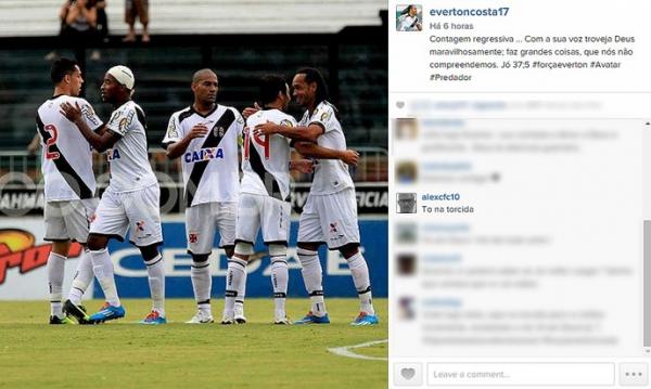 Everton Costa não esconde sua ansiedade por voltar a jogar futebol profissionalmente. Afastado dos gramados há mais de seis meses por causa de uma miocardite (processo inflamatório do músculo cardíaco), o atacante do Vasco mantém o otimismo e chegou até a postar uma foto na manhã desta segunda-feira, no Instagram, com a expressão "contagem regressiva" na legenda. Entre os comentários de incentivo na imagem, um chama a atenção. Alex, camisa 10 do Coritiba, um dos clubes que Everton defendeu na carreira, mandou seu apoio: "To na torcida", escreveu ele.