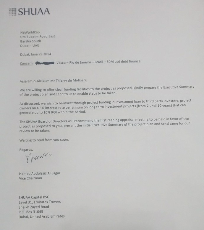 O candidato Julio Brant realizou na noite desta segunda-feira a convenção final de sua candidatura à presidência do Vasco. E um dos trunfos do empresário do ramo imobiliário nas eleições do próximo dia 11 é uma carta de intenção de um fundo de investimento árabe no valor de 50 milhões de dólares (cerca de R$ 124 milhões). O GloboEsporte.com teve acesso ao documento enviado pela empresa. Caso seja eleito, Julio estima ter acesso ao valor do empréstimo no período de oito meses a um ano.