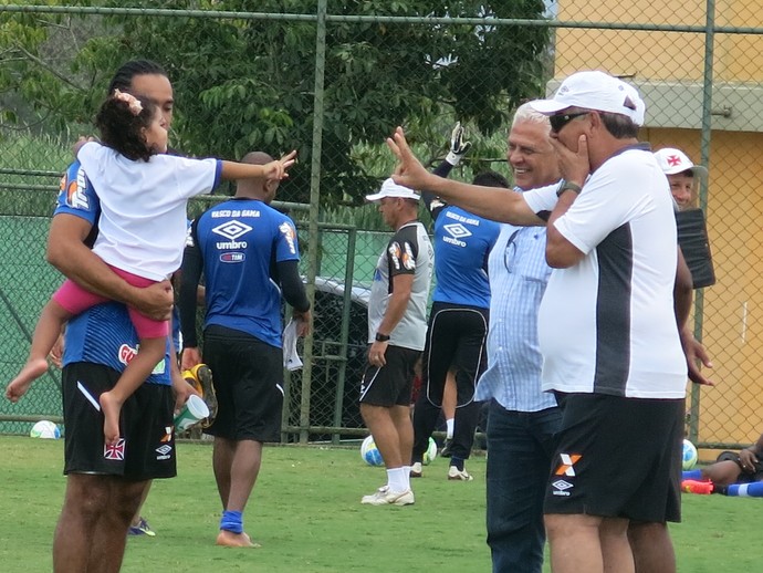 ![]() Joel Santana brinca com a filha de Everton Costa após o treinamento desta quarta-feira |