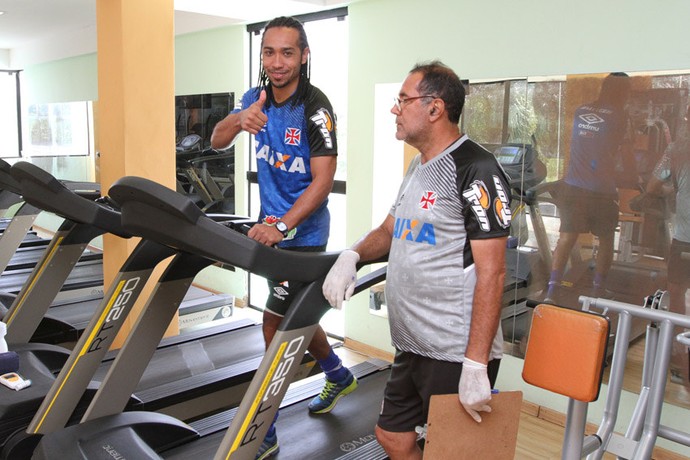O desejo de Everton Costa em voltar a jogar profissionalmente segue vivo. E nesta quarta-feira o atacante deu mais um passo rumo ao objetivo. Depois de ser liberado para voltar a fazer atividades físicas leves, Everton vestiu o uniforme de treino do Vasco e trabalhou na academia em frente ao CFZ. Como sempre, o jogador contou com a companhia da esposa Neiva e da filha Sofie. A pequena herdeira, aliás, ganhou até o carinho do técnico Joel Santana após o treino.