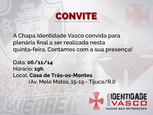 A Chapa Identidade Vasco fará nesta quinta-feira (6) a plenária final de sua campanha para a presidência do clube. O evento será às 19h na Casa de Trás-os-Montes, na Tijuca. Além de reunir membros e apoiadores da chapa, o encontro vai ratificar as propostas para a gestão do Vasco no próximo triênio.