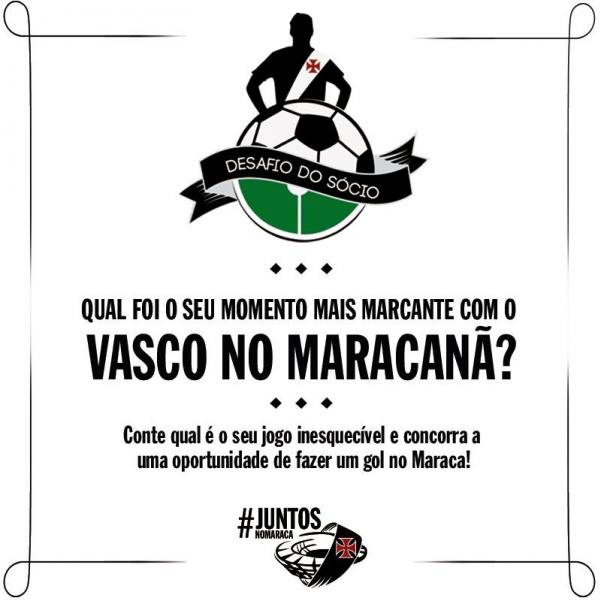 Qual foi o seu momento mais marcante com o Vasco no Maracanã? Conte qual é o seu jogo inesquecível e concorra a uma oportunidade de fazer um gol no Maraca. Os cinco sócios que enviarem as melhores respostas ganharão um ingresso para o jogo de sábado e participarão do Desafio do Sócio no gramado do Maracanã no intervalo, concorrendo a uma camisa.