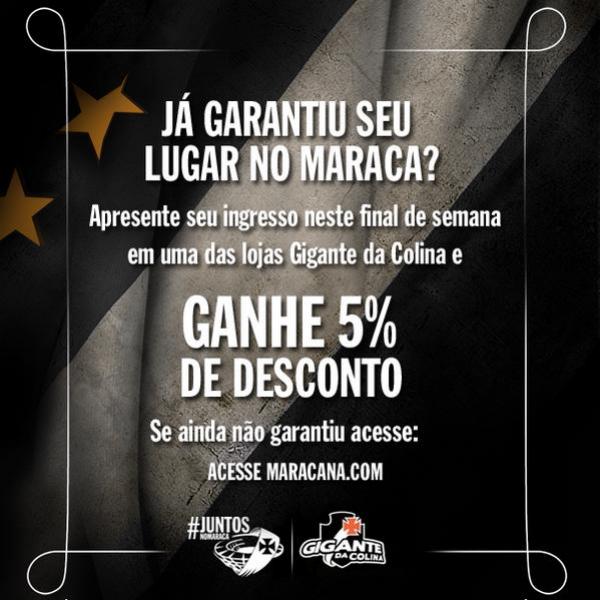 CR Vasco da Gama @crvascodagama Quem comprar ingresso para o jogo de amanhã terá 5% de desconto nas lojas Gigante da Colina. #JuntosNoMaraca