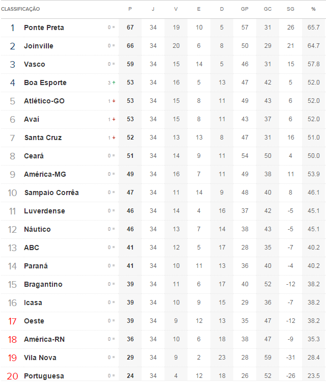 Terminada a 34ª rodada do Campeonato Brasileiro da Série B, a 15ª do returno, o Vasco, que derrotou o ABC por 1 a 0, manteve-se no 3º lugar na classificação. Sua diferença para a líder Ponte Preta manteve-se em 8 pontos. Já a diferença para o 5º colocado (Atlético-GO) subiu de 5 para 6 pontos.