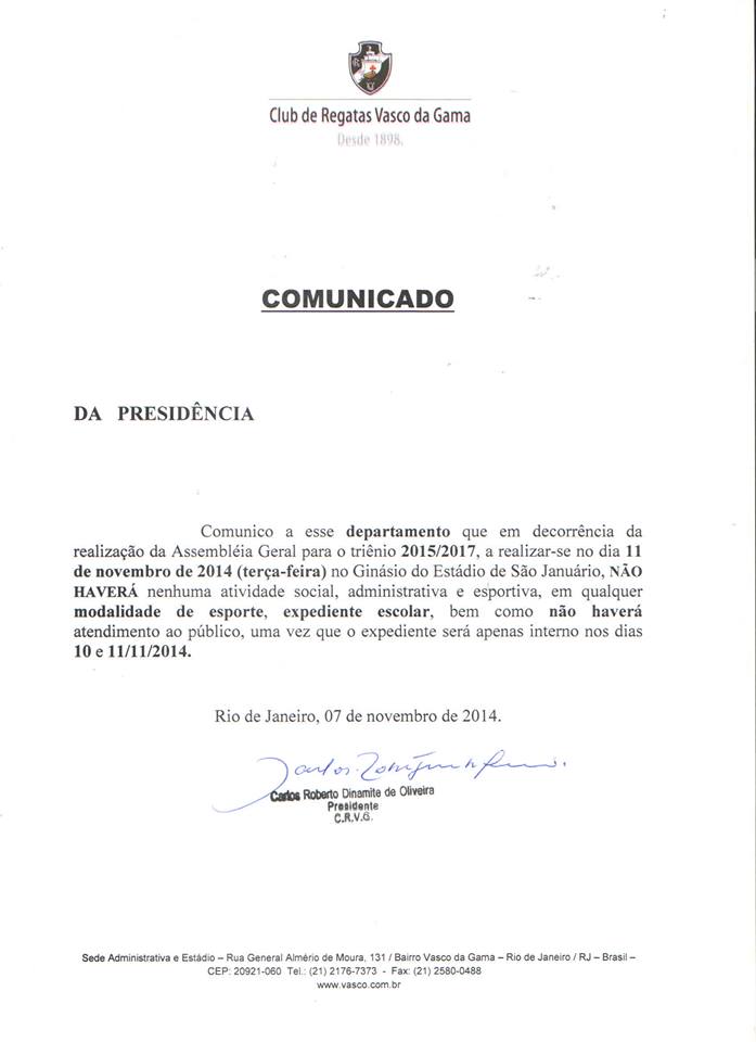 Em comunicado, Vasco informa que clube terá apenas atividades internas na 2ª e na 3ª-feira