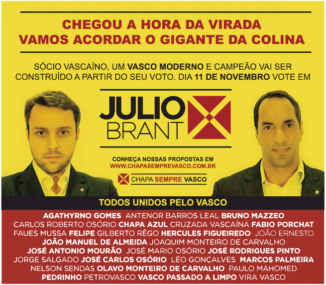 Em anúncio no jornal, chapa Sempre Vasco, de Julio Brant, lista pessoas e grupos que a apoiam