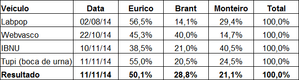 Terminadas as eleições do Vasco, é hora de comparar os resultados das pesquisas de intenção de voto e de boca de urna com os verificados nas urnas. Foi considerada sempre a pesquisa mais recente feita por cada veículo.