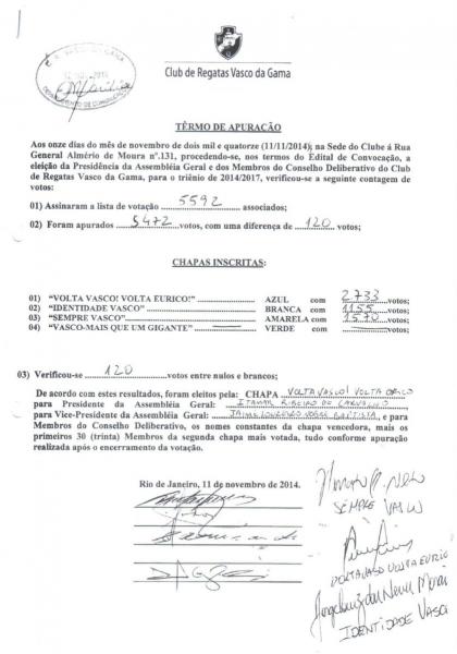 Publicamos abaixo o Termo de Apuração com o Resultado final das Eleições do Club de Regatas Vasco da Gama que elegeu a Presidência e Vice-presidência da Assembléia Geral, os 120 Conselheiros da maioria (oriundos da Chapa 'Volta Vasco, Volta Eurico') e os 30 Conselheiros da minoria (oriundos da Chapa 'Sempre Vasco') para o Mandato 2014-2017.
