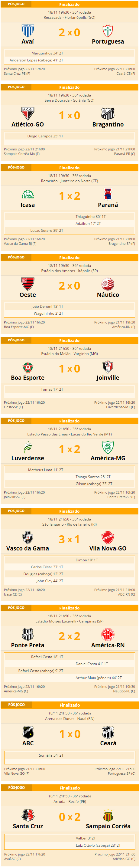 Terminada a 36ª rodada do Campeonato Brasileiro da Série B, a 17ª do returno, o Vasco, que derrotou o Vila Nova por 3 a 1, manteve-se no 3º lugar na classificação. A diferença para o 5º colocado (o Atlético-GO) manteve-se em 6 pontos. A diferença para o líder Joinville caiu de 10 para 7 pontos, mas o Gigante da Colina não tem mais chance de título.