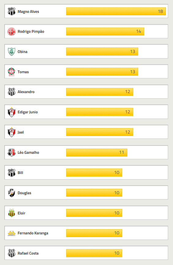 Com 10 gols marcados, Douglas é o artilheiro do Vasco na Série B. O goleador máximo da competição é Magno Alves, do Ceará, com 18 gols.