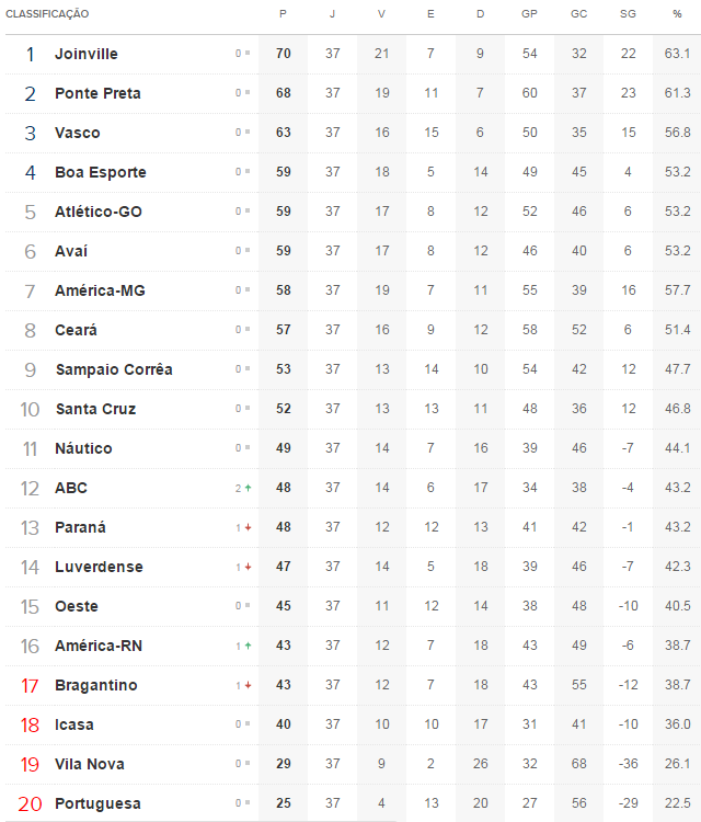 Terminada a 37ª rodada do Campeonato Brasileiro da Série B, a 18ª do returno, o Vasco, que empatou com o Icasa por 1 a 1, manteve-se no 3º lugar na classificação e terminará o campeonato nessa colocação. A diferença para o 5º colocado (o Atlético-GO) caiu de 6 para 4 pontos. A diferença para o líder Joinville manteve-se em 7 pontos. O Vasco garantiu o acesso para a Série A 2015.