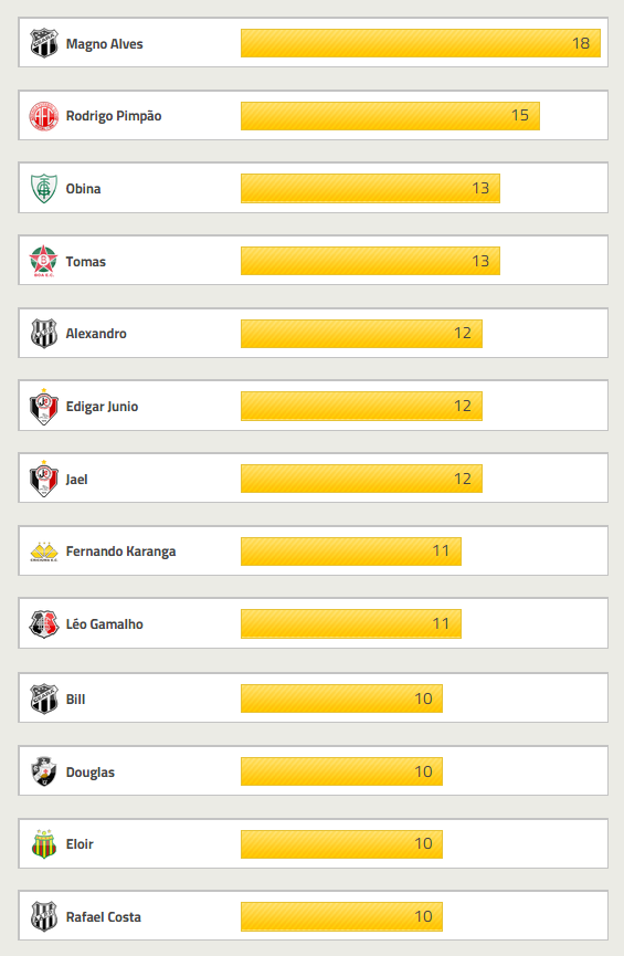 Com 10 gols marcados, Douglas é o artilheiro do Vasco na Série B. O goleador máximo da competição é Magno Alves, do Ceará, com 18 gols.