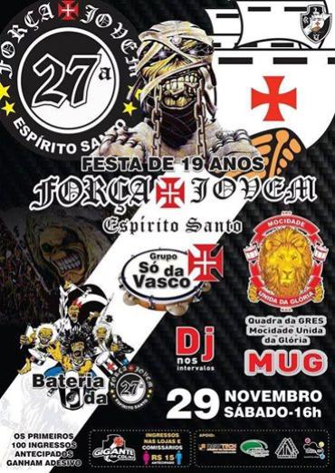 Participe da Festa de 19 anos da FJV 27ª Família Espírito Santo, dia 29 de novembro (sábado) às 16:00hs na Quadra do G.R.E.S. Mocidade Unida da Glória. Maiores detalhes no Flyer da Festa!!