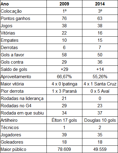 O Vasco obteve 13 pontos a menos no Campeonato Brasileiro da Série B de 2014 do que na outra oportunidade em que disputou a competição, em 2009. A comparação entre as duas campanhas é amplamente favorável à de 5 anos atrás. Confira abaixo: