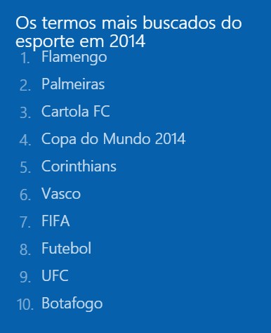 A Microsoft divulgou listas com os termos mais procurados no Bing neste ano por brasileiros. Os nomes e palavras estão organizados por categorias, tais como programas de TV, filmes, celebridades e notícias. Entretanto, não foi revelado o volume total de buscas para cada termo. O conteúdo por ser visto no site Bing Search Trends 2014 (bing.com/trends). Além do Brasil, é possível visualizar os assuntos que mais bombaram em países como Alemanha, Austrália, Canadá, Espanha, Estados Unidos, França, Índia, Itália, Japão e Reino Unido. Não há um ranking global de buscas, até o momento.