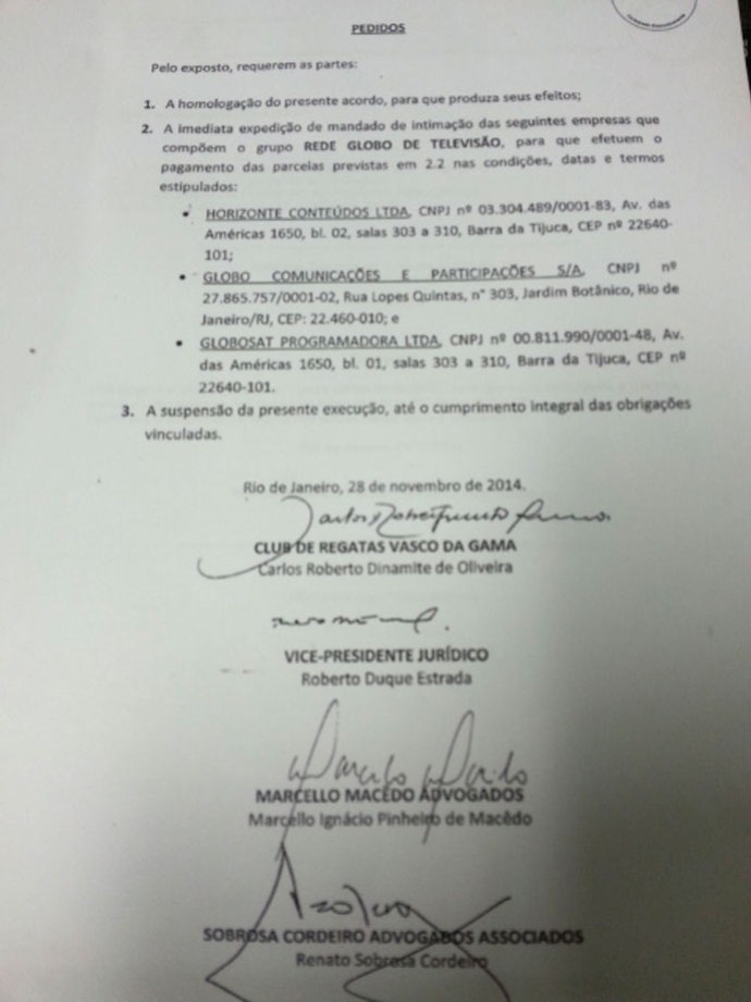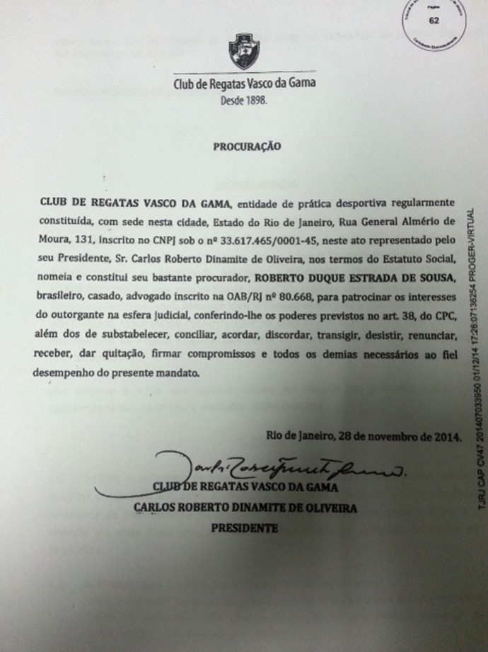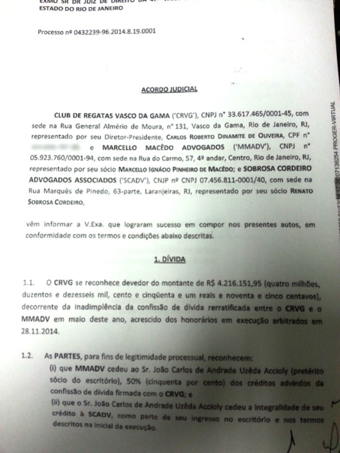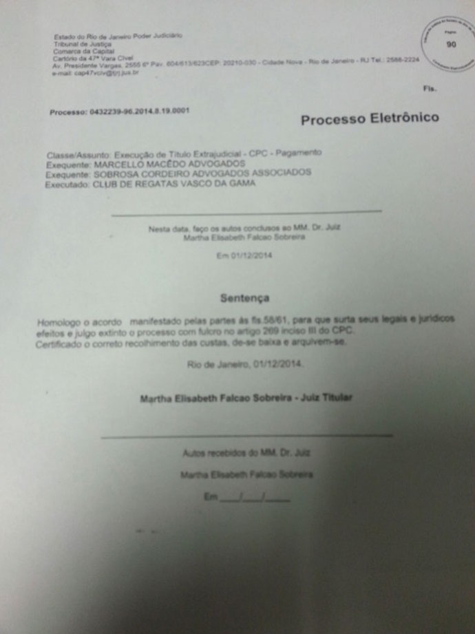 - O que me traz para denunciar isso hoje é o que chamo de conluio entre administração do Vasco, esse advogado que era contratado pelo Vasco, é que depois desse despacho do dia 28 foi dado entrada pela outra parte, a que está querendo executar, a do Marcello Macedo, de um acordo judicial que deu entrada exatamente às 17h26 do dia 1º. Mas junto desse acordo judicial veio assinado na data de 28 de novembro pelo seu Roberto Dinamite e pelo vice-presidente jurídico Roberto Duque Estrada com procuração dada pelo Roberto (Dinamite) para esse senhor Roberto Duque Estrada. No nosso entendimento, isso, que é assunto que vai ser discutido em juízo, demonstra o conluio entre as partes, no caso, o advogado, que trabalha para o Vasco, representando pelo seu Carlos Roberto Dinamite de Oliveira. Ele foi muito célere, o documento deu entrada 17h26, e às 17h32 o juízo homologou o acordo - disse Eurico.