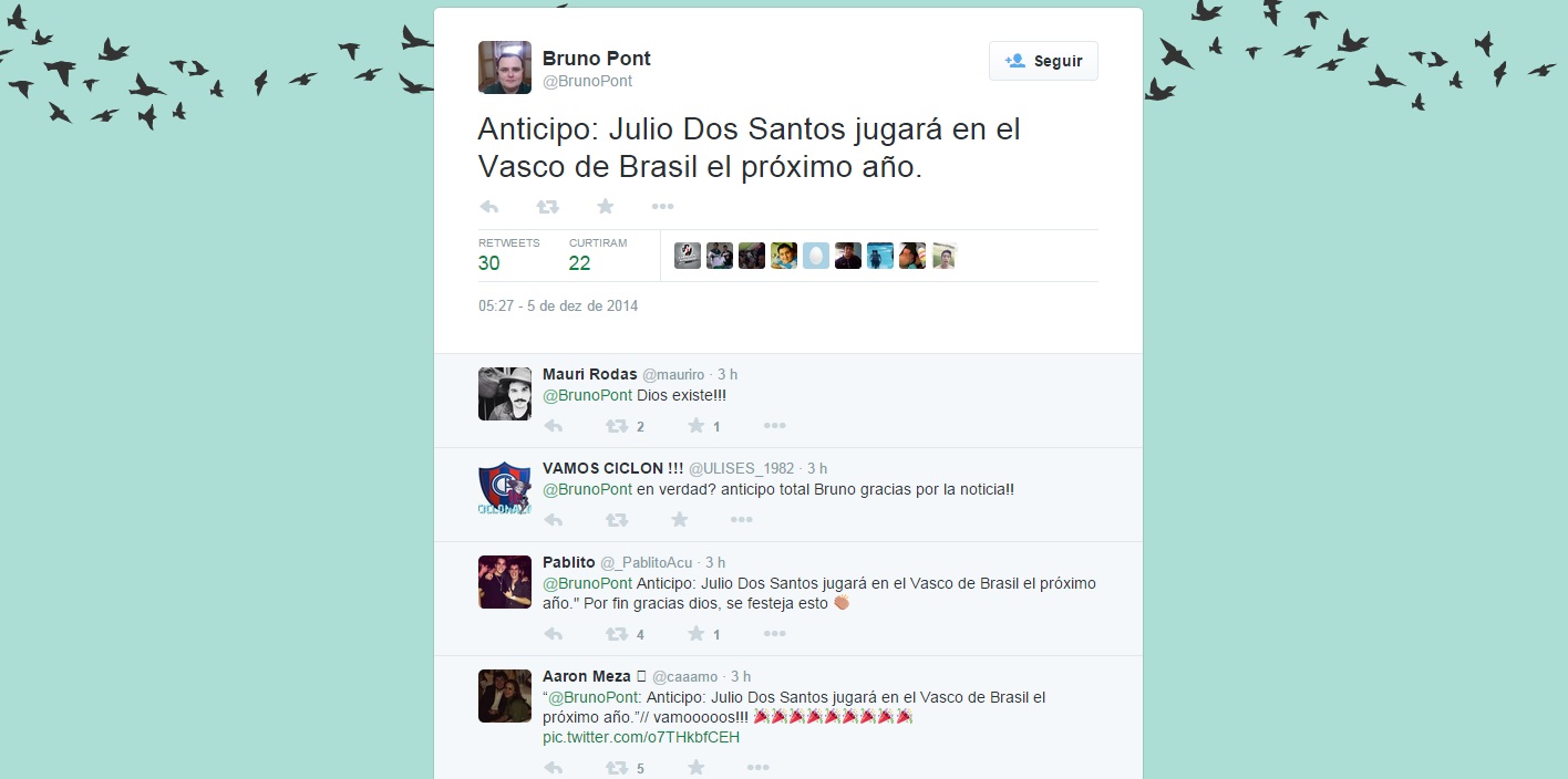 Bruno Pont, narrador da rádio paraguaia Cardinal AM, ‘cravou’ em seu perfil no Twitter que Julio dos Santos, atacante do Cerro Porteño, irá jogar no Vasco em 2015. O jogador além de ter atuado no futebol brasileiro, por Grêmio e Atlético-PR, jogou também no Bayern de Munique.