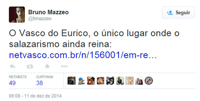 O ator Bruno Mazzeo usou o Twitter para criticar a decisão da nova diretoria do Vasco de tirar o nome de seu pai, Chico Anysio, da sala multimídia de São Januário. O ato foi determinado pelo presidente Eurico Miranda, em retaliação a Mazzeo, que apoiou Julio Brant nas eleições.