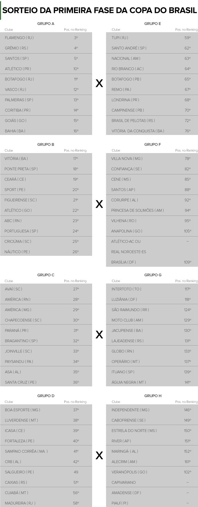 As chaves são nomeadas de “A” a “H”. Os clubes do Grupo A enfrentam os do Grupo E. Os do Grupo B terão pela frente os do Grupo F, os do Grupo C pegam os do Grupo G, e os do Grupo D encaram os do Grupo H. O sorteio será dirigido em duplas dentro das chaves, também formado segundo suas posições no RNC (o 1º do ranking faz dupla com o 2º, e assim por diante).