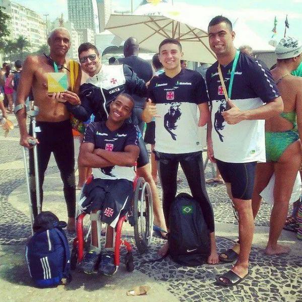 Os atletas da natação do Vasco da Gama Giovanni Eschenazi, Marcelo Santos, Daniel Teofilo e Paulo Afonso de Menezes estiveram disputando nesse sábado (13/12) o Rei e Rainha do mar, evento realizado na praia de Copacabana.