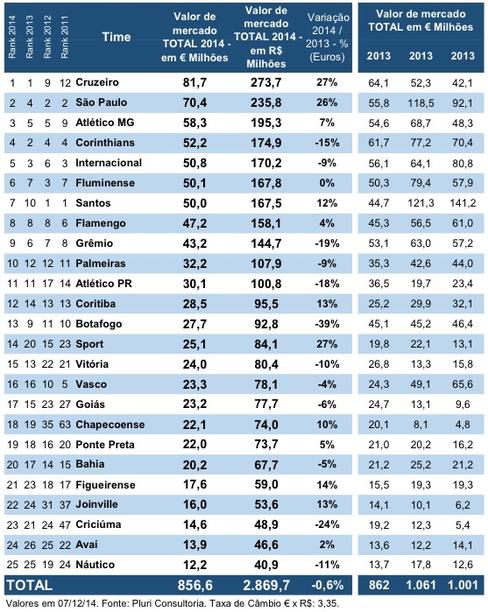 De acordo com a Pluri Consultoria, o Vasco repete a posição de 2013 e termina 2014 com o 16º elenco mais valioso do futebol brasileiro. Para acessar a íntegra do estudo, clique aqui.
