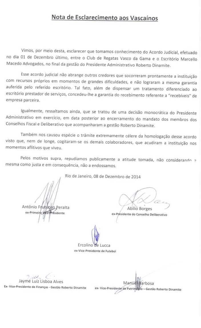 Em nota, Peralta, Abílio, Ercolino, Jayme Lisboa e Manuel Barbosa repudiam acordo feito entre Vasco e ex-advogado do clube