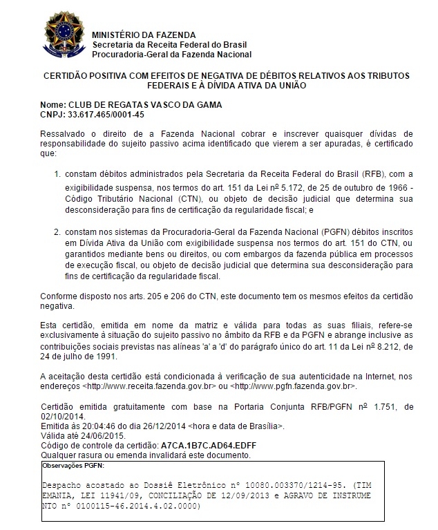 Pouco mais de vinte dias depois de tomar posse, o Presidente Eurico Miranda anunciou que o VASCO conseguiu a Certidão Positiva com efeitos de Negativa, o que regulariza a situação do clube em relação aos débitos fiscais. A Certidão é o documento, expedido em conjunto pela Procuradoria-Geral da Fazenda Nacional - PGFN e pela Receita Federal do Brasil - RFB, que certifica a situação fiscal da pessoa física ou jurídica (contribuinte) perante a Fazenda Nacional, em relação aos débitos previdenciários e aos não previdenciários.