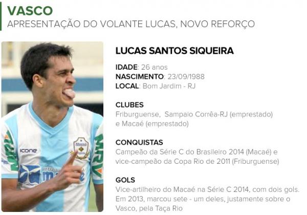 A qualidade descrita como rara contrasta com o nome para lá de comum: Lucas, um dos novos reforços do Vasco da Gama para a temporada 2015, fez por onde merecer sua primeira chance em um clube de grande porte. Aos 26 anos de idade, o volante que pertence ao Friburguense vai defender apenas sua quarta equipe na carreira - foi emprestado duas vezes ao Macaé e uma ao Sampaio Corrêa-RJ antes de se aventurar no Gigante da Colina. Dois dos treinadores mais significativos na vida do atleta trataram, então, de apresentar as credenciais de Lucas à torcida vascaína. Sua apresentação oficial acontece nesta sexta-feira.