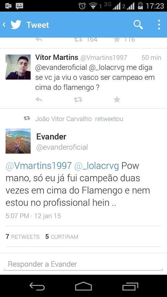 Artilheiro do Vasco na Copinhacom quatro gols, Evander vem ganhando destaque na competição com a camisa cruz-maltina e, talvez por isso, já começa a ser provocado por torcedores rivais. Através de uma rede social, um torcedor do Flamengo provocou e perguntou ao jogador se ele já viu o Vasco ser campeão em cima do Rubro-negro, a resposta veio em grande estilo: “Pow, mano, só eu já fui campeão duas vezes em cima do Flamengo e nem estou no profissional hein...”, disse o atacante.