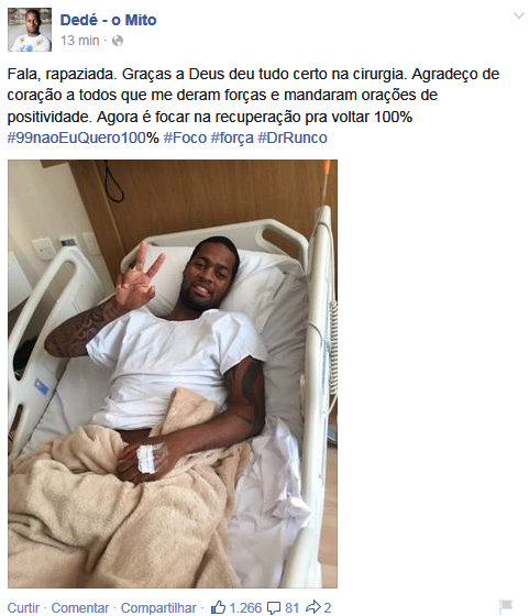 Cirurgia de Dedé é bem sucedida e jogador agradece o carinho dos fãs
