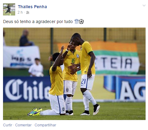 Autor de gol pela Seleção Sub-20 contra a Colômbia, Thalles posta foto e comemora no Facebook