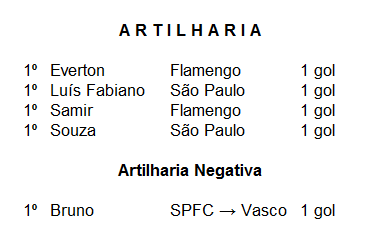 A competição teve 4 artilheiros, que terminaram empatados com 1 gol: os rubro-negros Éverton e Samir e os são-paulinos Luís Fabiano e Souza.