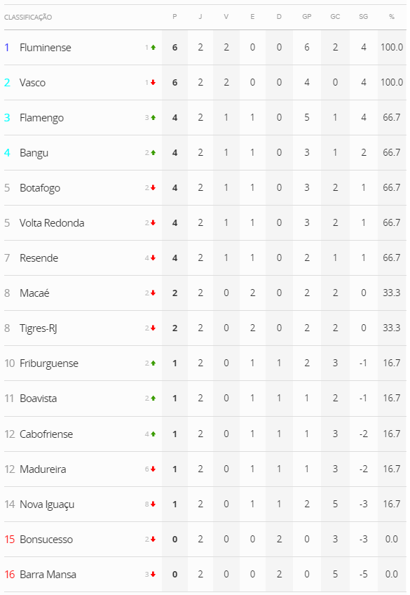 Terminada a 2ª rodada da Taça Guanabara, que equivale à 1ª fase do Campeonato Estadual 2015, o Vasco, que derrotou o Madureira por 2 a 0, caiu da 1ª para a 2ª colocação na tabela, ficando atrás do novo líder Fluminense devido ao critério de desempate do número de gols marcados (o Tricolor tem 6, contra 4 do Gigante da Colina).