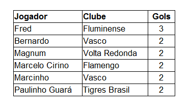 Bernardo e Marcinho, com 2 gols cada, estão na 2ª colocação na artilharia, liderada por Fred, do Fluminense.