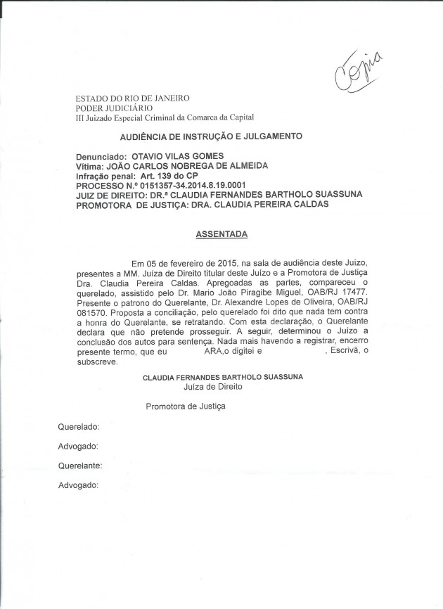 Na última quinta, antes de ser julgado por este caso, foi oferecida ao senhor Gomes nova possibilidade de retratação. Se o estivesse mesmo perseguindo, como defendeu o “jornalista” Renato Maurício Prado em mais um ato de irresponsabilidade pública, eu mesmo não teria aceitado tal possibilidade, uma vez que já havia ocorrido anteriormente audiência específica para acordo. Porém, aceitei os termos que recompõem, para mim, a seguinte verdade: o depoimento do senhor Gomes na 17ª DP quanto ao tal “mensalão”, que me incluía ao citar seus “operadores”, foi uma enorme farsa. Não fosse assim, o senhor Gomes não teria se retratado perante o Juízo do III Juizado Especial Criminal, conforme documento abaixo reproduzido.