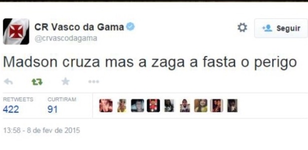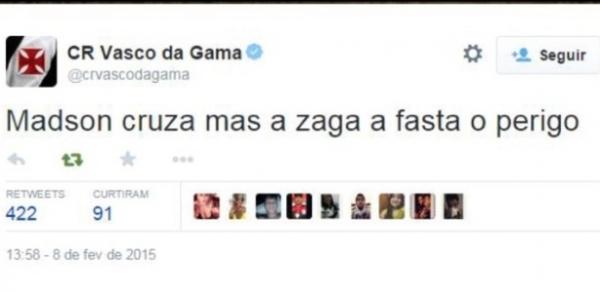 Outro erro que chamou bastante atenção foi quando o twitter oficial do Vasco comentou um lance de jogo: "Madosn cruza mas a zaga a fasta o perigo [sic]". O neologismo praticado pelo clube viralizou em poucos minutos e o responsável apagou em seguida. "Vasco se a fasta da liderança após empatar com Tigres", cornetou um internauta.