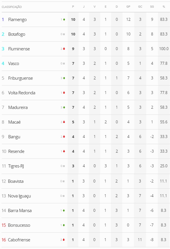 Realizados 5 dos 8 jogos da 4ª rodada da Taça Guanabara, A liderança provisória é do Flamengo, que goleou a Cabofriense por 5 a 1. Se o Fluminense vencer o Boavista nesta 5ª-feira (12/02), volta à 1ª colocação. O Vasco, ameaçado pelo Volta Redonda (que enfrenta o Nova Iguaçu) e pelo próprio Macaé, seu adversário desta 5ª-feira às 19h30 em São Januário, precisa vencer para seguir no G4 sem sustos.