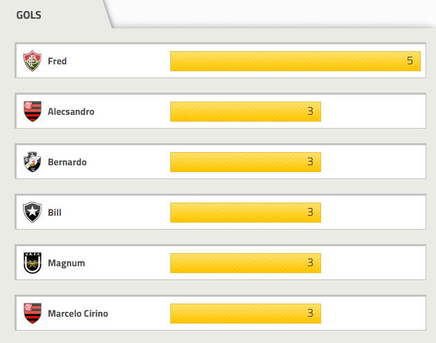 Bernardo, com 3 gols, está na 2ª colocação na artilharia, que é liderada por Fred, do Fluminense, com 5 gols.