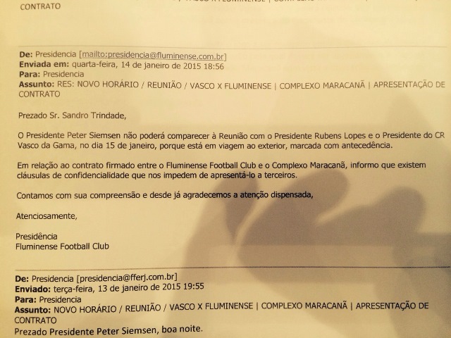 O presidente da FERJ, Rubens Lopez, por sua vez, garante que a cláusula jamais foi apresentada à entidade.Com exclusividade, a Rádio Globo obteve o único documento apresentado pelo Fluminense através de um email.