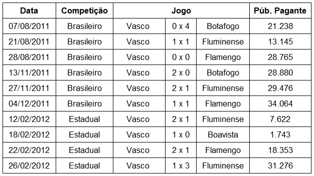 O Vasco retorna ao Engenhão neste domingo (22/02), no clássico diante do Fluminense, quase 3 anos após sua última partida no estádio. Ela aconteceu no dia 26/02/2012, contra o próprio Tricolor, que saiu vencedor por 3 a 1, ficando com o título da Taça Guanabara. Antes dessa derrota, no entanto, o Gigante da Colina havia emplacado uma série de 8 partidas sem perder no estádio.