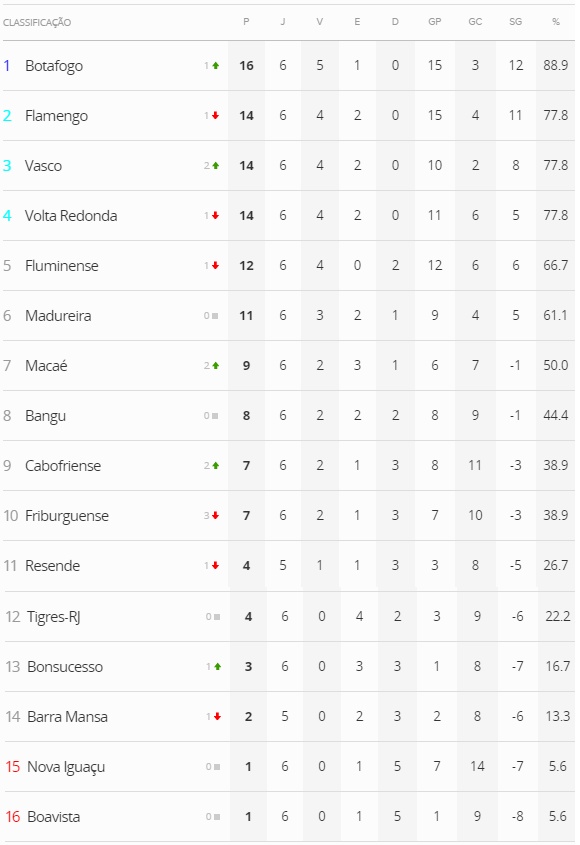A 1 jogo do fim da 6ª rodada da Taça Guanabara (Barra Mansa x Resende, marcado para 25/02), o Vasco, que derrotou o Fluminense por 1 a 0, subiu da 5ª para a 3ª colocação na tabela, voltando ao G4 e mantendo-se a 2 pontos do líder, que agora é o Botafogo.