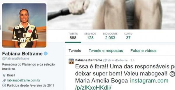 Ao lado do presidente Eurico Miranda, em São Januário, Fabiana Beltrame foi apresentada como reforço do remo do Vasco há 15 dias. Porém, a remadora da seleção brasileira, que antes defendia o Flamengo, se esqueceu de mudar seu perfil no Twitter. Já com uma foto vestindo a camisa do Vasco, ela ainda não atualizou por completo a página.