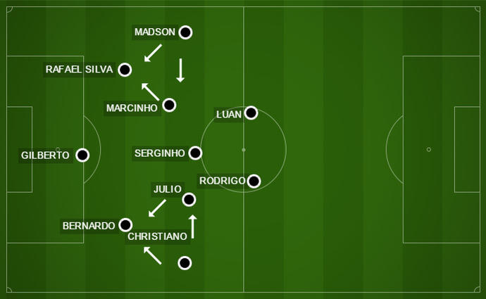 Doriva vai escalar a equipe com Martín Silva, Madson, Luan, Rodrigo, Christiano; Serginho, Julio dos Santos, Bernardo, Marcinho, Rafael Silva; Gilberto. O treinador pede a aproximação de Julio dos Santos de um lado e de Serginho do outro para se juntarem aos laterais Christiano e Madson, além de Bernardo e Rafael Silva, respectivamente. Marcinho também recua mais para ajudar na armação do ataque, enquanto Gilberto fica à espera da bola na área.