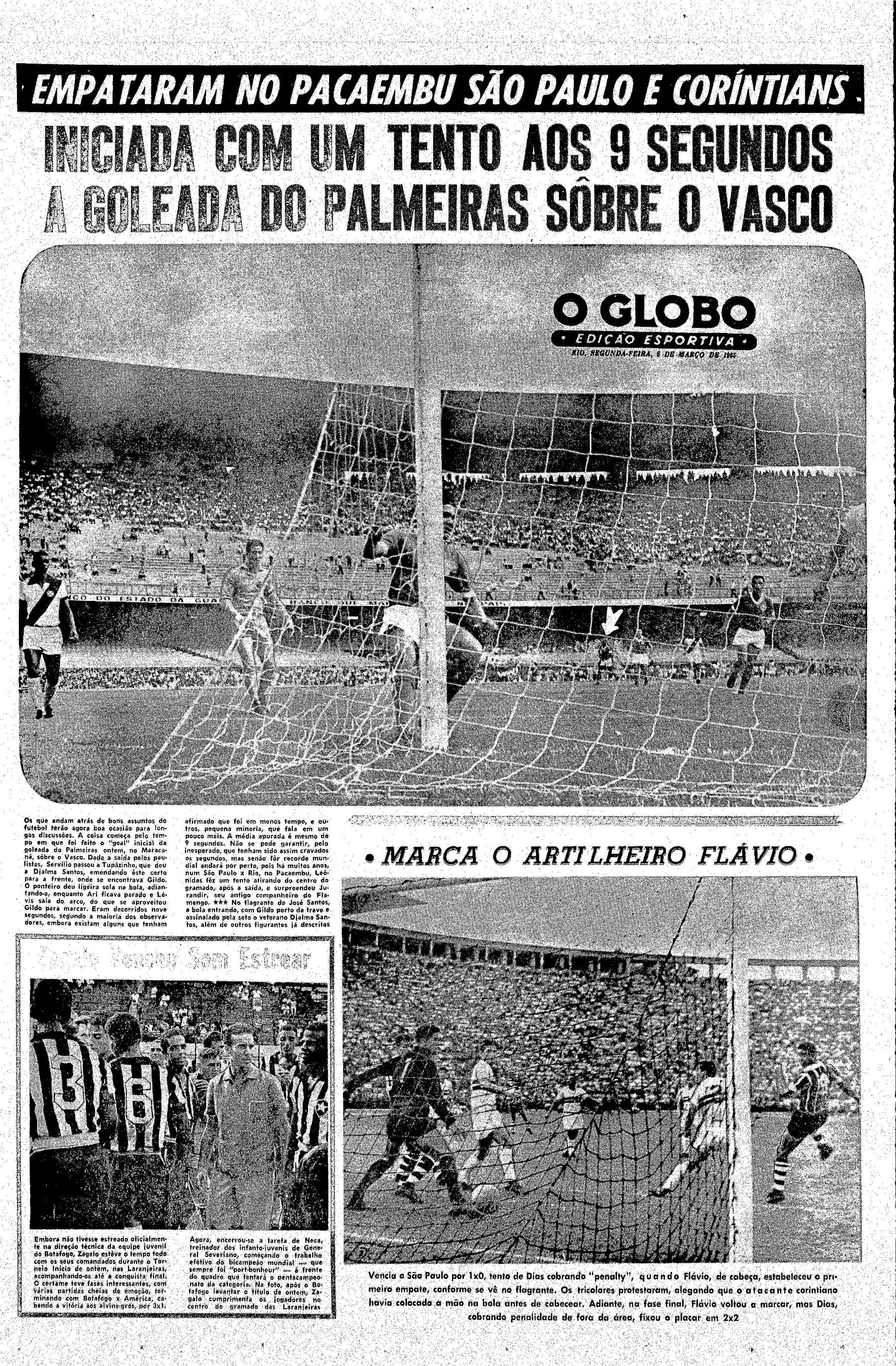 Os que andam atrás de bons assuntos terão agora boa ocasião para discussões. A coisa começa pelo tempo em que foi feito o “goal” inicial da goleada de 4 a 1 do Palmeiras ontem, no Maracanã, sobre o Vasco. Dada a saída pelos paulistas, Servílio passou a Tupãzinho, que deu a Djalma Santos, emendando este certo para a frente, onde se encontrava Gildo. Enquanto Ari ficava parado e Lévis saía do arco, Gildo se aproveitou para marcar. Eram decorridos nove segundos, segundo a maioria, embora existam alguns que tenham afirmado que foi menos tempo, e outros, pequena minoria, que fala em um pouco mais.